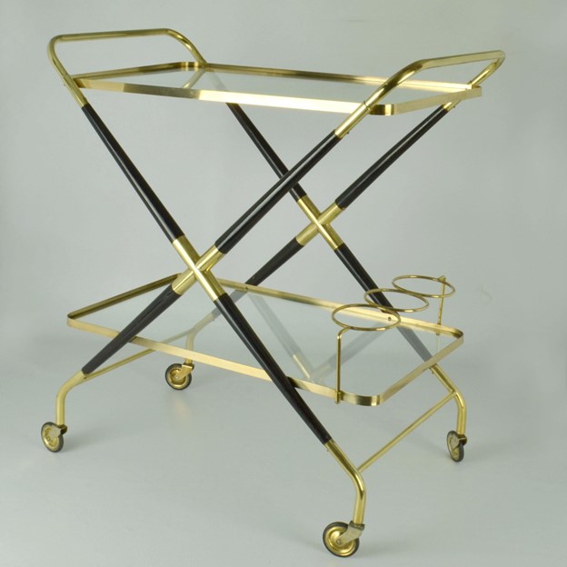 Bar carts evolved from Victorian-era tea tables. The elaborately carved wooden tables of the past were reimagined as sleek and movable brass, steel, or chrome serving stands, with one shelf for liquor and another for glassware. One bar cart example that exemplifies the era’s emphasis on functionality is the Cesare Lacca Bar Cart Cocktail Trolley, which also included a three-bottle wine rack.