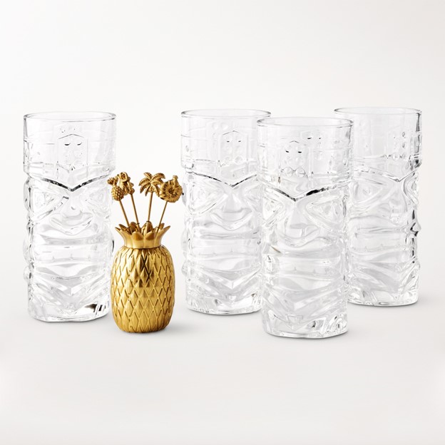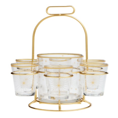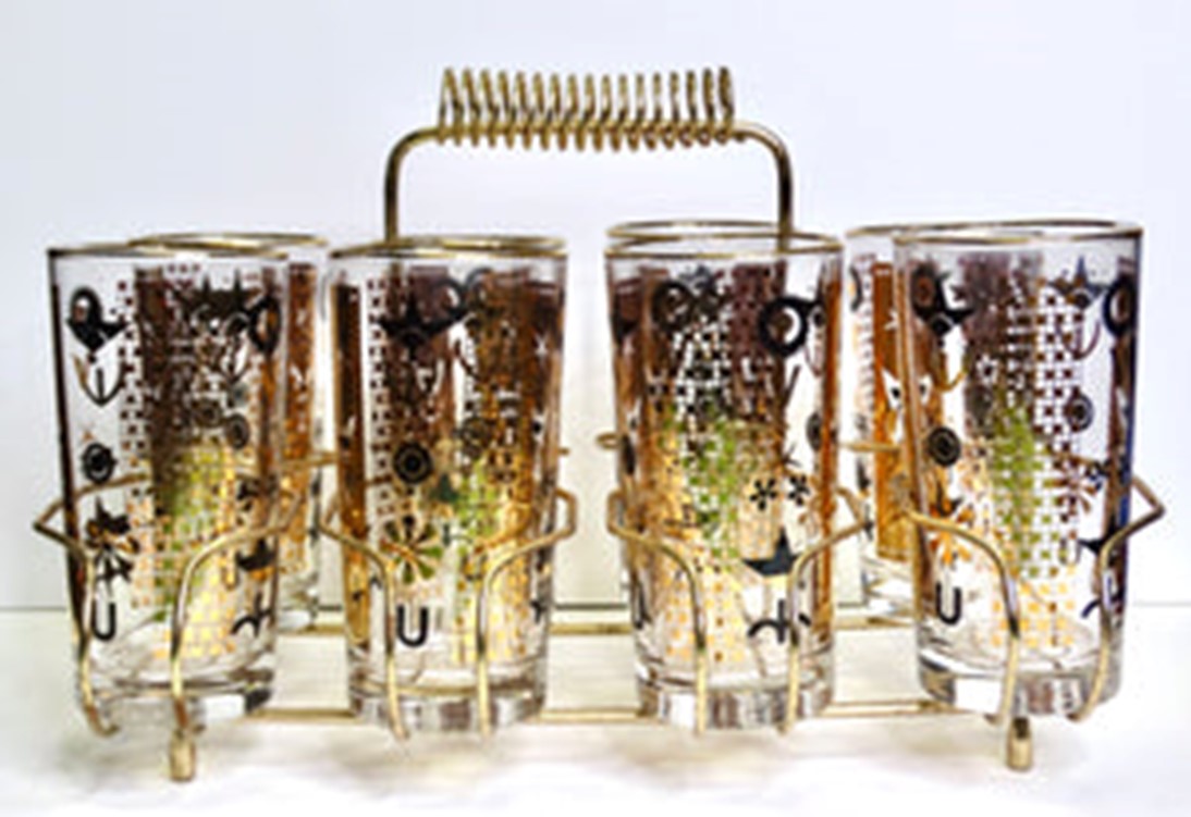 Glassware of the era is characterized by highly stylized space-age graphics, often with metallic silver or gold highlights. Cocktail glasses exuded a jazzy party mood and often came in matching metal carriers.