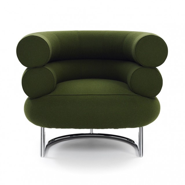 Her Bibendum chair was influenced by the Michelin Man, the tire company’s famous logo. With a fully upholstered seat, back, and armrests, it is supported by a polished chrome-plated tubular steel base.